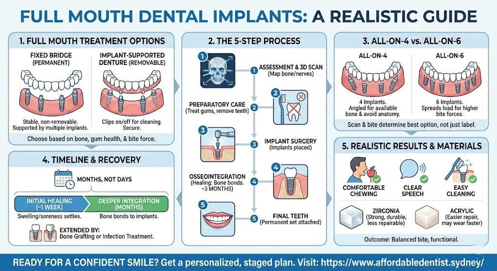 Most “full mouth” plans replace one or both arches (upper, lower, or both). Many people choose a fixed bridge supported by several implants, often described as full arch dental implants. Others prefer an implant-supported denture that clips on and off for cleaning.